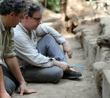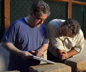 David Stuart and Marcello Canuto examining looted panels.